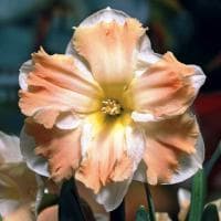 Наверняка именно такая мысль посещает многих при виде трубчатого нарцисса Кум Лауде. И в этом нет ничего удивительного, ведь этот цветок действительно отличается от традиционных нарциссов. В период роспуска, который припадает на апрель-май, Кум Лауде просто вспыхивает бело-оранжево-желтым пламенем. На фоне внешних молочно-белых лепестков зажигается широкая разрезная корона оранжевого цвета, по краю которой проходит розовая гофрированная кайма.